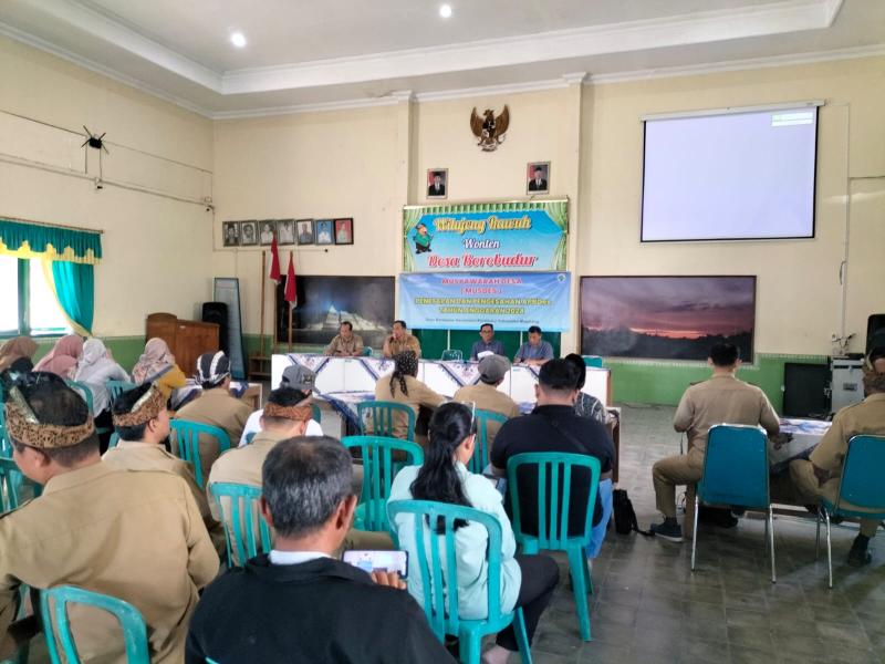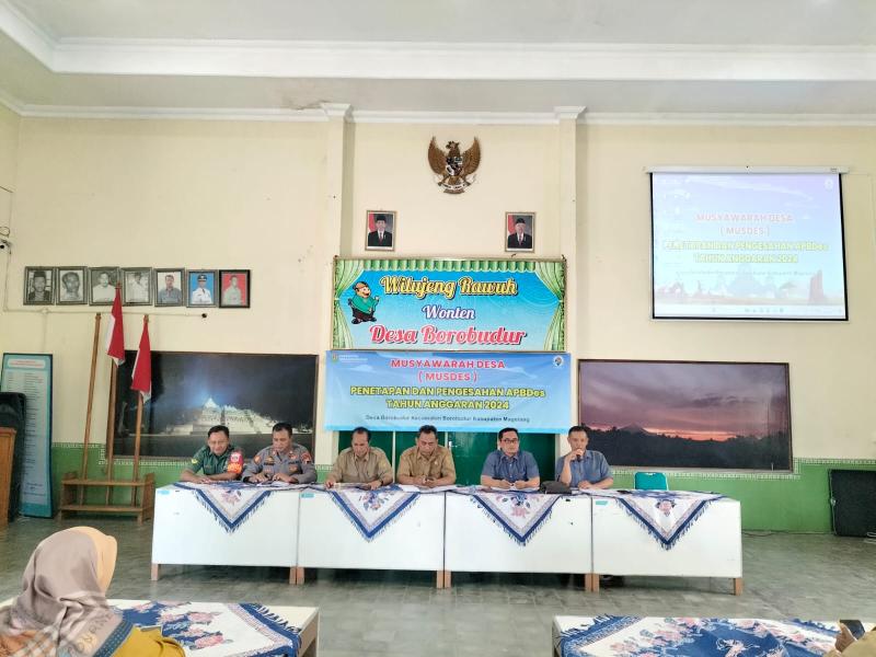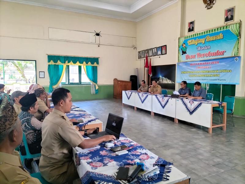 Musyawarah Desa Borobudur Penetapan dan Pengesahan APBDes Tahun Anggaran 2024 yang dilaksanakan pada hari Selasa, 19 Maret 2024 di Aula Desa Borobudur berjalan dengan lancar. Acara tersebut dipimpin oleh Darsono S. T. selaku Ketua BPD Desa Borobudur. Kepala Desa Borobudur Anwar Ujang ML, SE dalam sambutannya menjelaskan bawha Musdes yang dilaksanakan pada hari ini telah melalui beberapa tahapan antara lain Musyawarah Dusun yang dilakukan oleh Dusun di Desa Borobudur dan Pra Musdes yang telah dilaksanakan beberapa waktu yang lalu. Beliau juga menambahkan bahwa Musdes ini adalah penjabaran dari RKPDes. Diakhir sambutannya beliau juga mengatakan semoga semua kegiatan yang telah direncanakan dapat direalisasikan dengan baik dan lancar sesuai Peraturan yang ada.